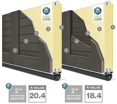 2″-thick Intellicore® polyurethane foam insulation with a thermal break. R-values range from 18.4 – 20.4 depending on the design.