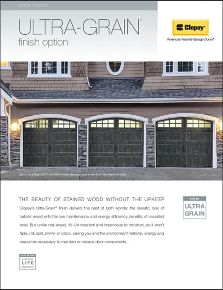Clopay’s Ultra-Grain® finish offers the best of both worlds: the authentic appearance of natural wood combined with the low maintenance and energy efficiency advantages of insulated steel. Unlike real wood, it’s UV-resistant and resistant to moisture, so it won’t fade, rot, split, shrink, or crack. This saves both you and the environment the material, energy, and resources needed to maintain or replace door components.